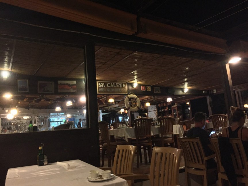 Degustamos en esta ocasión Gamba roja ibicenca, ya habíamos probado este año las Gambas rojas de Denia y las Gambas rojas de Garrucha. Estaban muy ricas y con sabor, pero por debajo de las Gambas rojas de Denia que son Top 1, estas estarían en la posición Top 3. Dejando en el Top 2 a las Gambas rojas de Garrucha. A continuación, comimos Alas de raya frita ibicenca, muy jugosas. La ración era bastante grande y no pudimos con ella, para hacer sitio al Gallo San Pedro al Horno que fue nuestro plato principal de ese día.