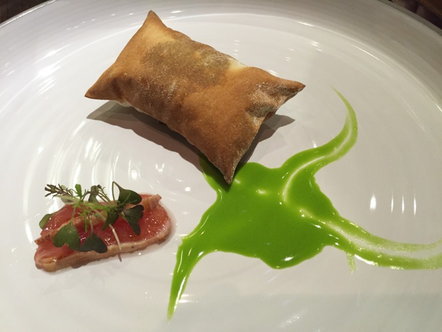 Empezamos con un Bocadillo de chorizo, buen sabor con matices de chorizo de pueblo. Seguimos con un plato de Mantequilla de cabra y Queso fresco de búfala, hierbas aromáticas y avellana, sabores que nunca habíamos experimentado en boca, suaves y delicados a la par. Luego vino la Anchoa al salazón sobre tosta de pan, sabor brutal, de los mejores platos del menú, de esos bocados con los que un bar en la calle Laurel de Logroño podría vivir, y ser la tapa más laureda.