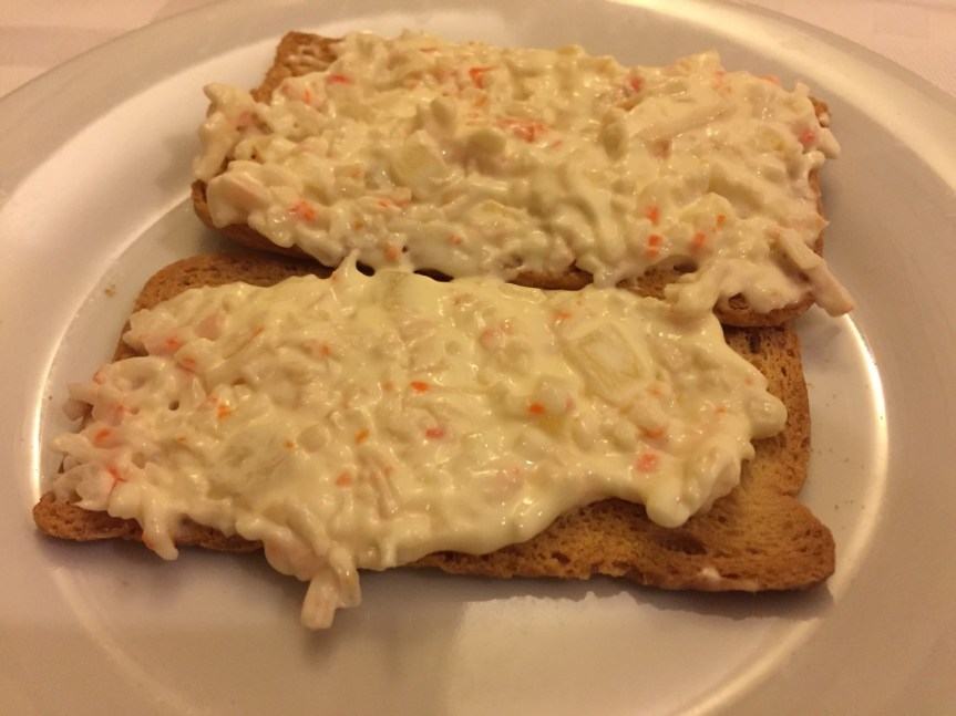Trompeta negra con tirabeques, salmón, mayonesa y encurtidos caseros: 8.2