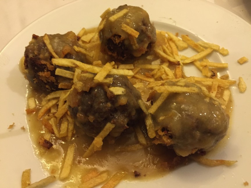 En el quinto asalto comimos unos Perretxicos salteados con habitas, salsa de yema y velo de tocino salado ibérico, saborazo total de todos los ingredientes y en el conjunto muy bueno.