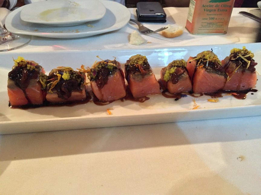 Otro básico es el Tartar de Lubina Salvaje, miso y mostaza de Dijon. Está riquísimo, una combinación muy buena, y un sabor muy suave de la Lubina Salvaje. La Carne roja de Guikar es otro plato excepcional, gran sabor, no tiene nada que envidiar a carnes de larga maduración y más nombre, y la escalibada que le acompaña está deliciosa, buen acompañamiento.