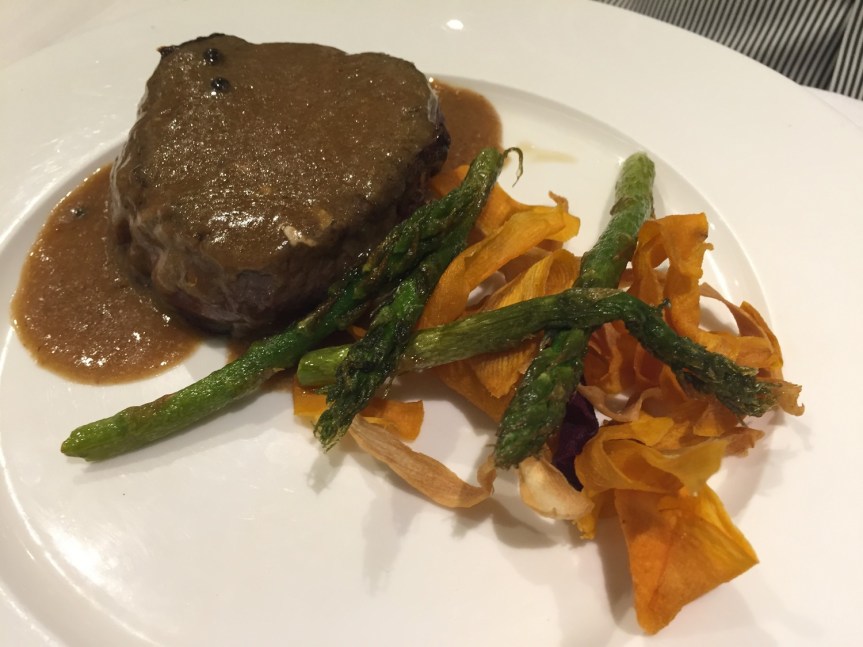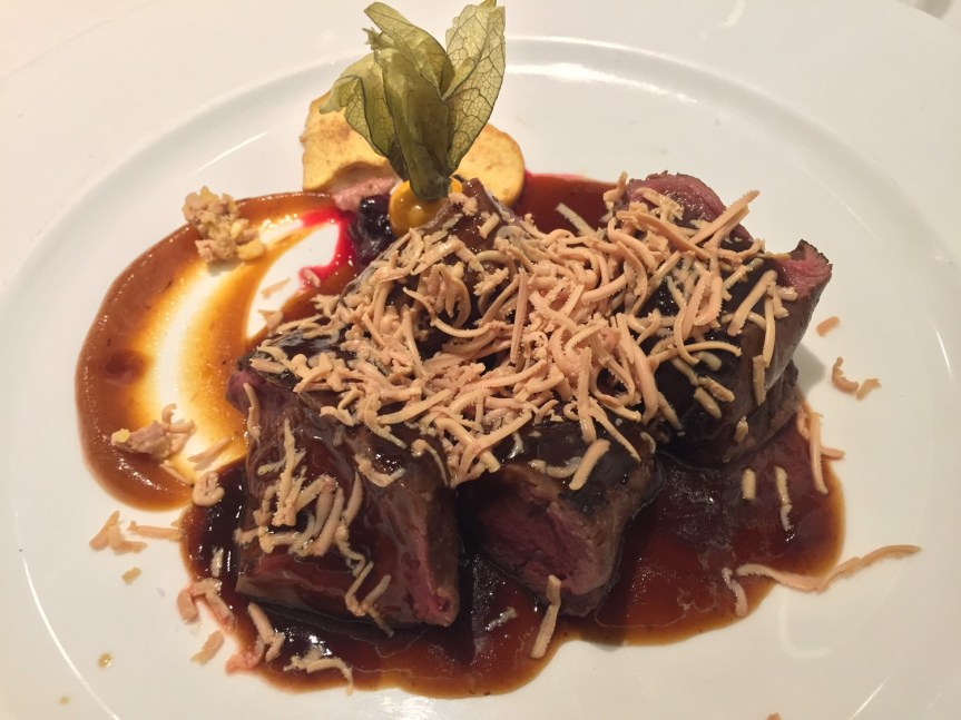 Otro básico es el Tartar de Lubina Salvaje, miso y mostaza de Dijon. Está riquísimo, una combinación muy buena, y un sabor muy suave de la Lubina Salvaje. La Carne roja de Guikar es otro plato excepcional, gran sabor, no tiene nada que envidiar a carnes de larga maduración y más nombre, y la escalibada que le acompaña está deliciosa, buen acompañamiento.